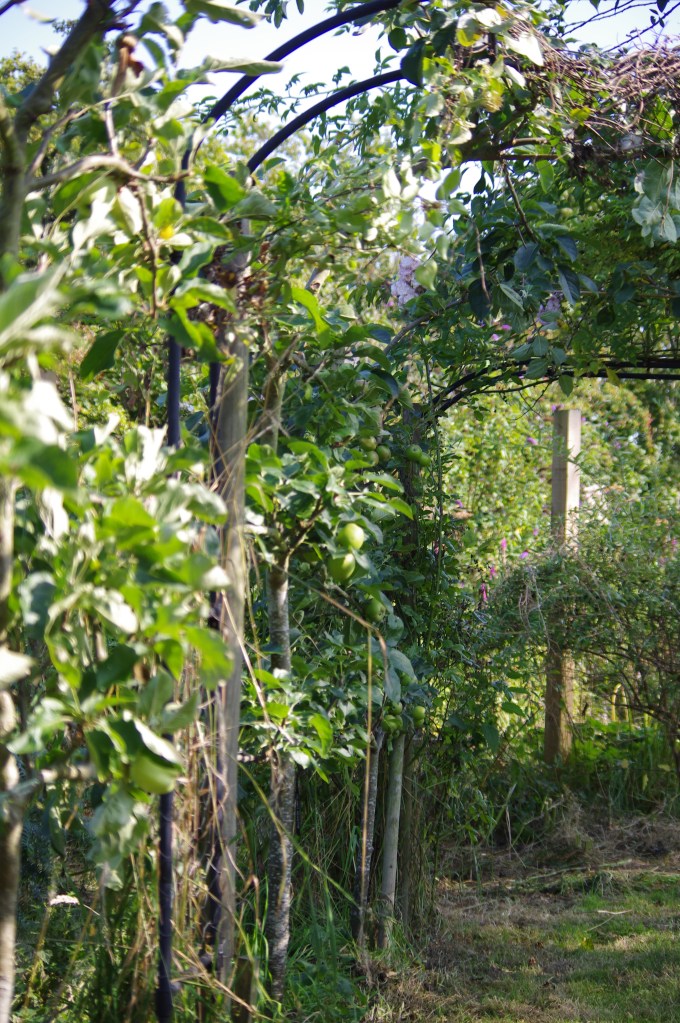 The apple tunnel is now in its third year and doing better than I expected with most of the trees having filled their alloted space. All the trees are on MM106 semi vigorous rootstocks allowing them to provide the at least four tiers to the espaliers that I wanted. Although having one variety would give the most impressive blossom display, the original idea of the tunnel was to allow for a range of varieties to be grown in a small space. The downside of this means that the blossom appears at slightly different times. One of my favourites from here is Orleans Reinette, an 18th century French variety, with a rich flavour that develops with storing. We also planted Winston and Suntan alongside grafts from some of our existing trees like Bardsey, Lord Lambourne and Grenadier.