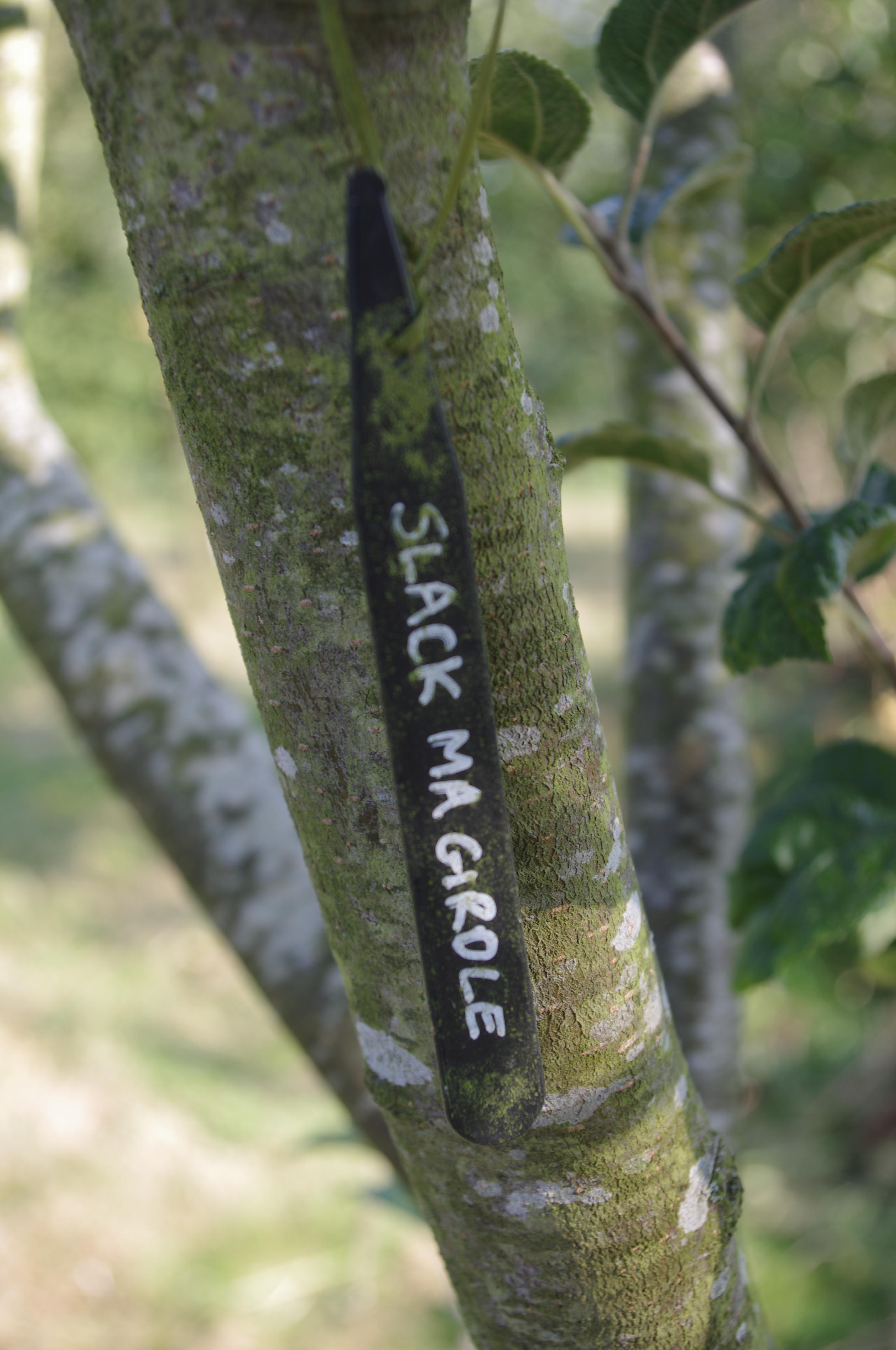 As I walk round I also notice how each tree has its own individual character partly determined by its genetics, guiding its vigour and habit but also the pruning cuts that i have made in its formative years. Catshead prefers to spread in a languorous manner while Ashmeads Kernel rockets upwards, constantly reaching for the sky. Weather, animals and human hand have all played a roll in a story that i can read in its branches and bark. The names are as individual and interesting as their stories, Court Pendu Plat, Pig Yr Wydd (Goose’s Beak), Cornish Gillyflower to the strange sounding Puckrup Pippin, which far from causing a sour expression, is named after the area by Puckrup Hall near Tewksbury. Some names are descriptive of the fruit, some dedicated to the discoverer or nurseryman and some are comically monikered like ‘Slack ma girdle’.