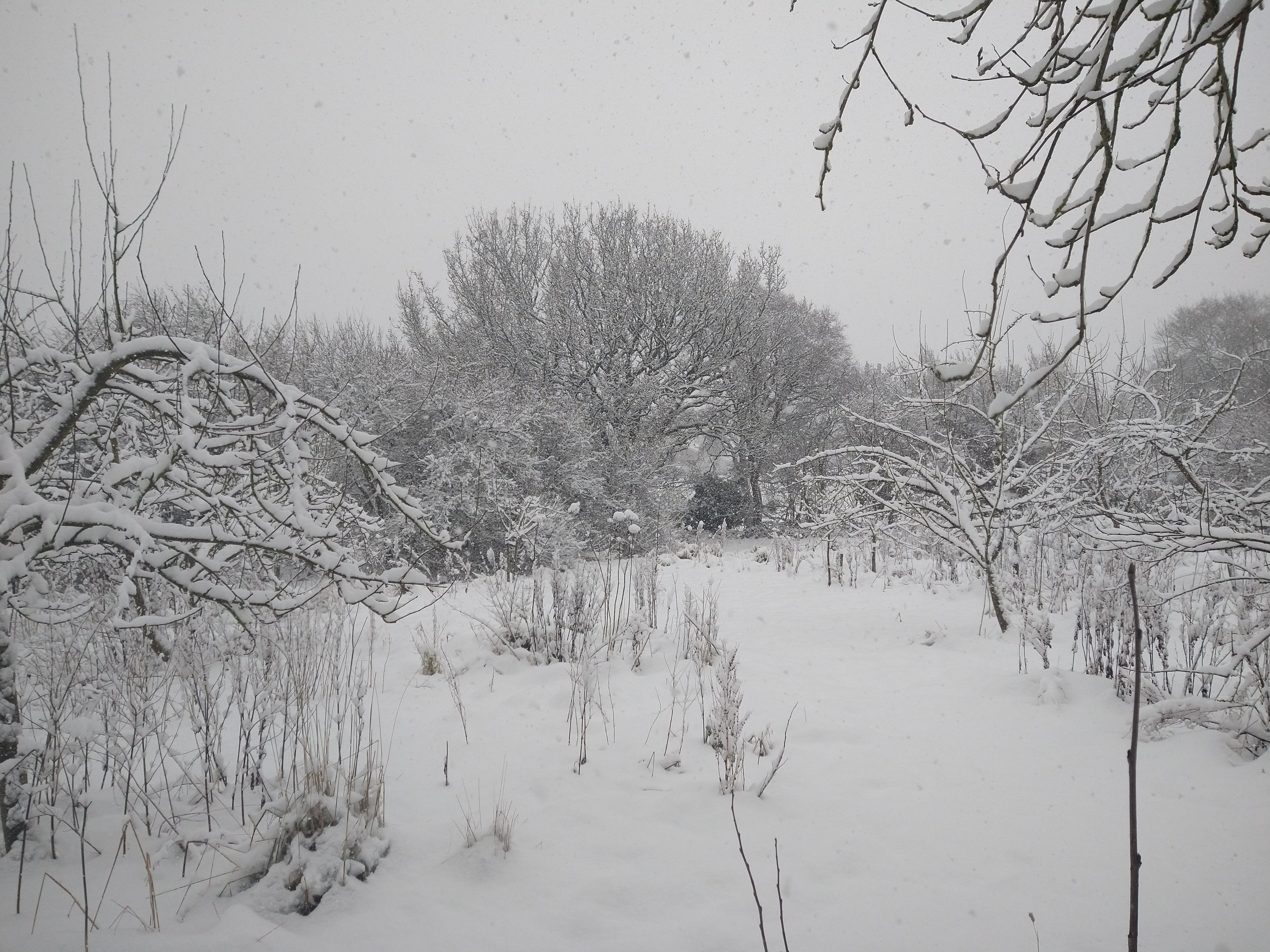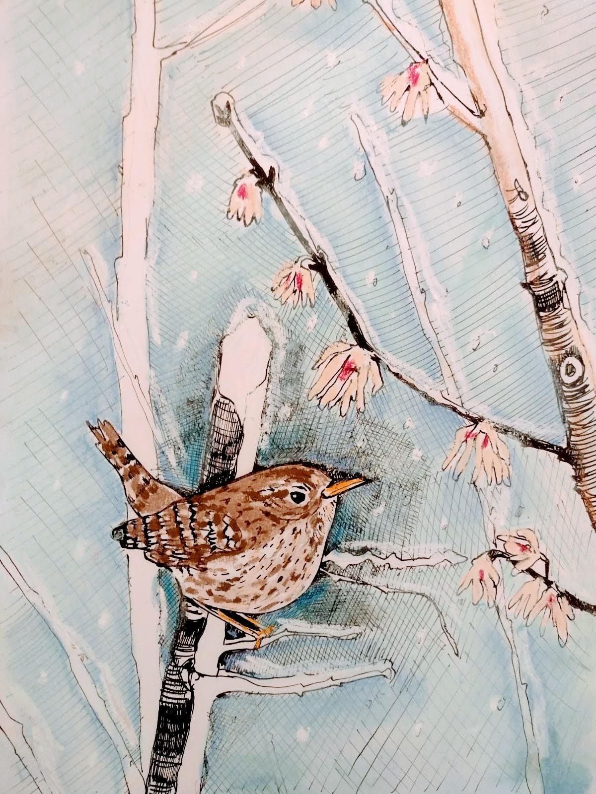 Under the glowering sky my boots heavy with mud sunk into the sodden ground, relentlessly battered by days of rain. It was now noticeably colder and a biting breeze cut through the air carrying with it a solitary snowflake that settled on my coat. Silence descended as the sky suddenly filled with a flurry of white, only to be broken by the sound of a rustling from the bare branches of a small bush. A little wren was sheltering from the cold, it’s outline almost indiscernible against the tangle of branches, picking through the leaf litter and soil searching for insects, essential sustenance for the harsh winter. Amongst the calm of this scene I watched a battle of life and death unfold, repeated endlessly in every corner of the garden. We both stopped, each trying to decipher the other, in an instant it was gone again flitting through the garden, a crossing of two worlds in a fleeting moment.